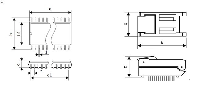 产 品 型 号 IC封装 a b b1 c d e e1 A B C 083-0127-140 FP14 13.0 10.65 7.60 2.65 0.51 1.27 7.62 40.20 20.0 16.4 083-0127-160 FP16 13.0 10.65 7.60 2.65 0.51 1.27 8.89 40.20 20.0 16.4 083-0127-180 FP18 13.0 10.65 7.60 2.65 0.51 1.27 10.16 40.20 20.0 16.4 083-0127-200 FP20 13.0 10.65 7.60 2.65 0.51 1.27 11.43 40.20 20.0 16.4 083-0127-240 FP24 13.0 10.65 7.60 2.65 0.51 1.27 13.97 40.20 20.0 16.4 083-0127-280 FP28 13.0 10.65 7.60 2.65 0.51 1.27 16.51 40.20 20.0 16.4DESCRIPTION & ORDERING INFORMATION
