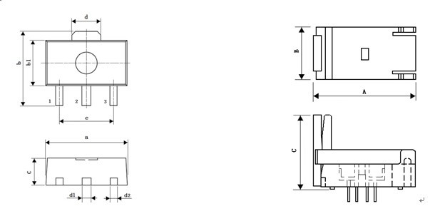 产 品 型 号 IC封装 a b b1 c d d1 d2 e A B C 054-0089-031 SOT-89-3L 4.5±0.2 4.1±0.2 2.5±0.2 1.5±0.2 1.65±0.1 0.5±0.1 0.4±0.1 3.0±0.2 24.7 12.6 18.0DESCRIPTION & ORDERING INFORMATION